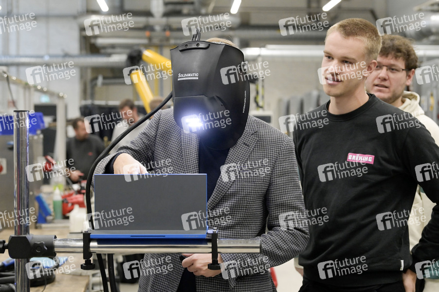 Christian Lindner beim Lehrgang virtuelles Schweißen mit Schweißermaske während des Rundgangs im ABB-Ausbildungszentrum Berlin-Pankow. Berlin, 16.09.2024
