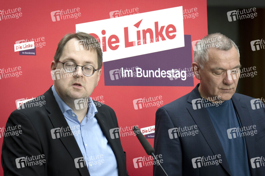Sören Pellmann und Jan van Aken bei einem Pressestatement der Partei Die Linke im Reichstagsgebäude. Berlin, 24.03.2025