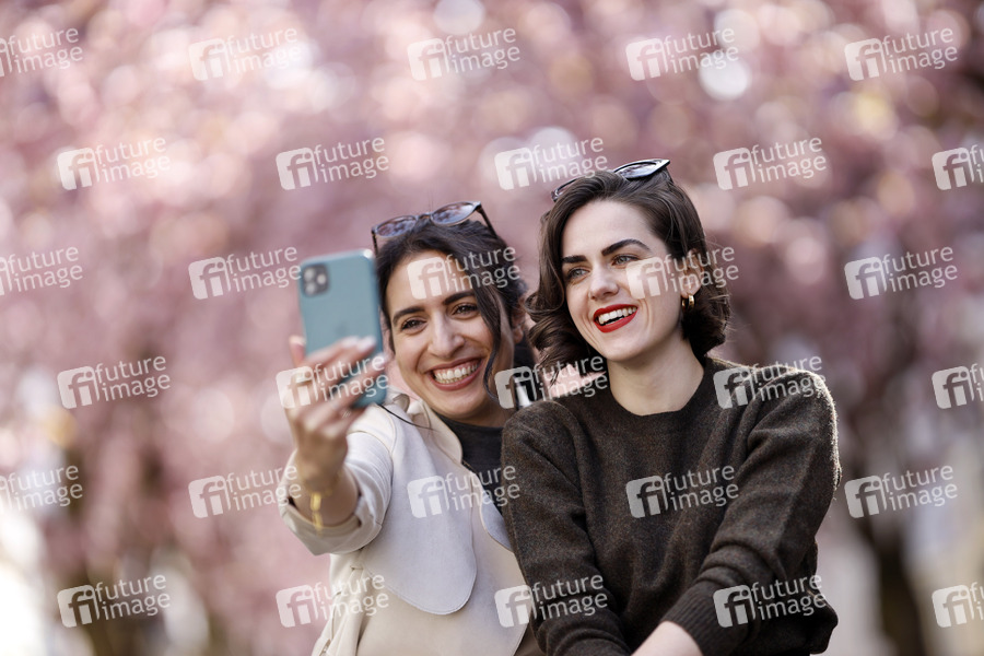 Passanten, Anwohner und Touristen bewundern die alljährliche Bonner Kirschblüte in der Bonner Altstadt rund um die Heerstraße. In diesem Jahr darf das Naturschauspiel nur unter Einhaltung strenger Corona-Maßnahmen beobachtet werden. Ordnungsamt und Polizei kontrollieren die Einhaltung von Maskenpflicht und Mindestabstand in den Gassen. Wenn der Andrang zu groß wird, sollen einzelne Straßen auch gesperrt werden. Bonn, 22.04.2021