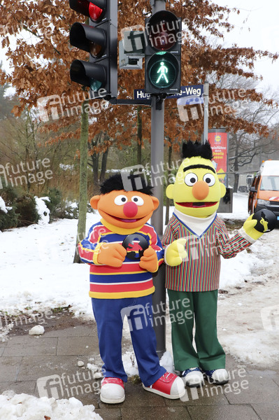 Ernie und Bert bei der Einweihung der Sesamstraße Ampelmännchen am Hugh-Greene-Weg. Hamburg, 13.01.2026