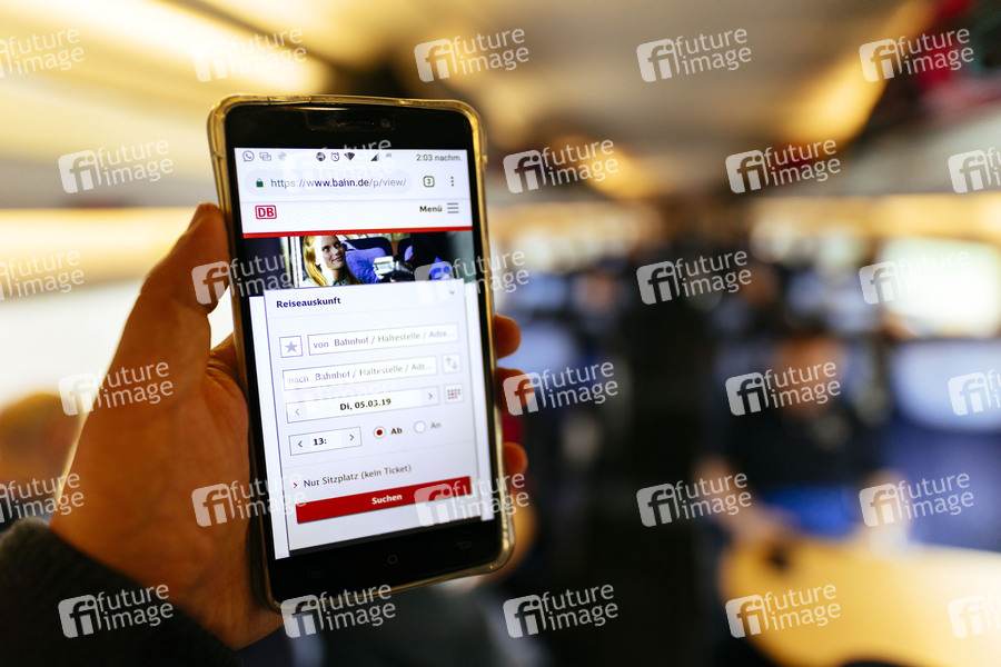 Reiseauskunft der Deutschen Bahn unter bahn.de aufgenommen in einem ICE. Köln, 13.03.2019