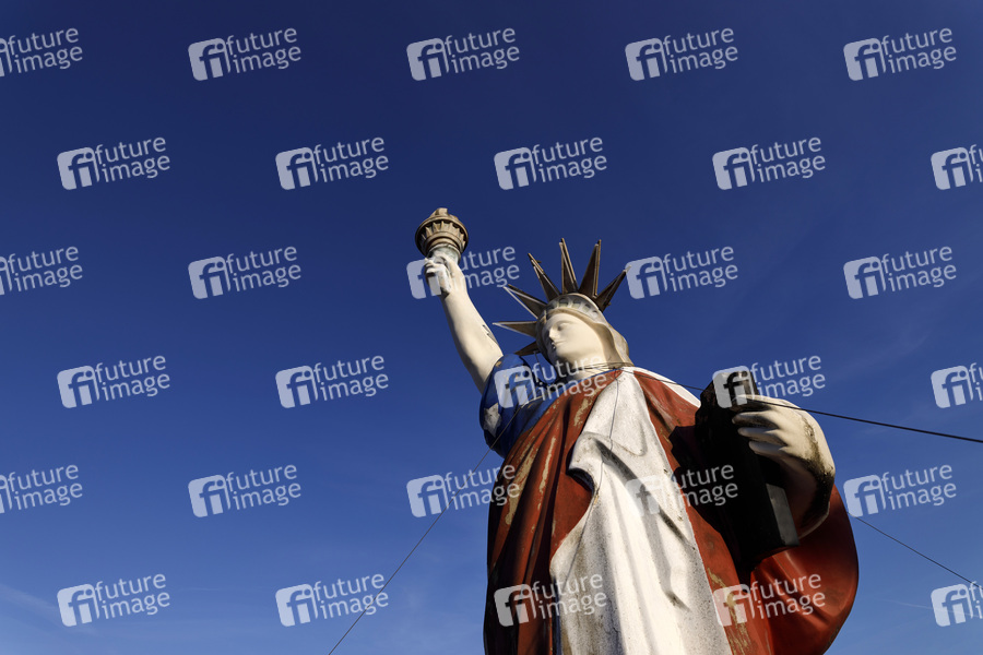 Statue of Liberty, Lady Liberty, Model, Amerikanismus, US-Kultur, us-amerikanisch, Skulptur, Neoklassizismus, neoklassizistisch, Libertas, römische Göttin der Freiheit, Wahrzeichen, Demokratie, Freiheit, abendländische Kultur, Einheitskultur, Nachbau, Fackel, Leuchtfeuer, Tafel mit Datum der Unabhängigkeit, Declaration of Independence, Symbolbild, Symbolfoto
