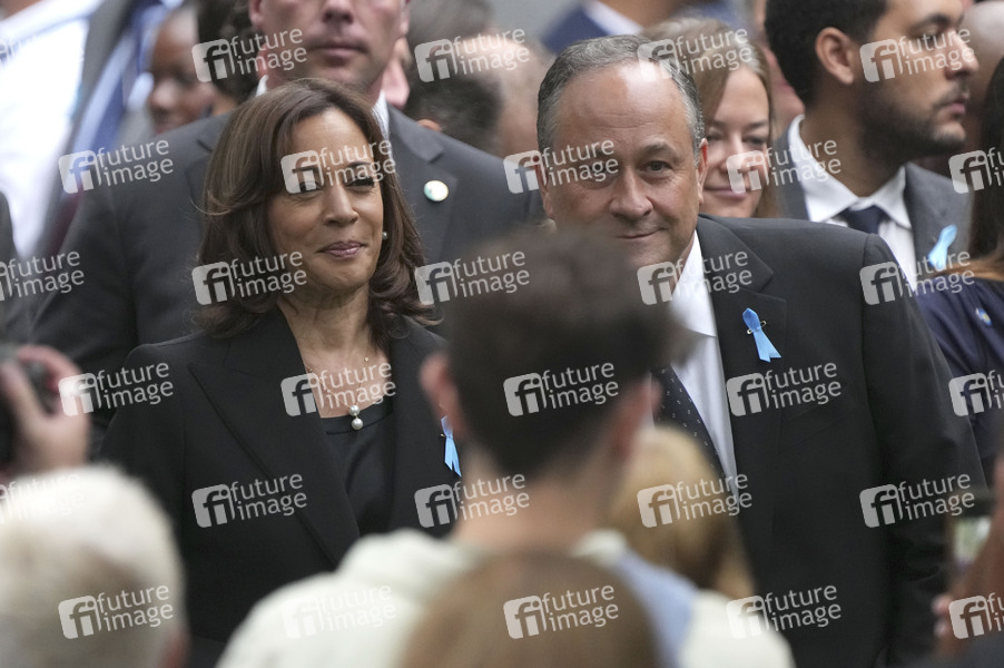 Kamala Harris mit Ehemann Douglas Emhoff bei der Gedenkfeier für die Opfer der Terroranschläge vor 21 Jahren am 9/11 Memorial. Mit Schweigeminuten und der Verlesung der Namen der fast 3000 Todesopfer haben die USA am Sonntag an die Terroranschläge vom 11. September 2001 erinnert. Am früheren Standort des World Trade Centers in New York verlasen Angehörige wie jedes Jahr am 11. September die Namen aller Anschlagsopfer. New York, 11.09.2022