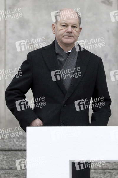 Olaf Scholz nach der Gedenkstunde zum Tag des Gedenkens an die Opfer des Nationalsozialismus anlässlich des Jahrestages der Befreiung des NS-Vernichtungslagers Auschwitz im Deutschen Bundestag vor dem Reichstagsgebäude. Berlin, 27.01.2022