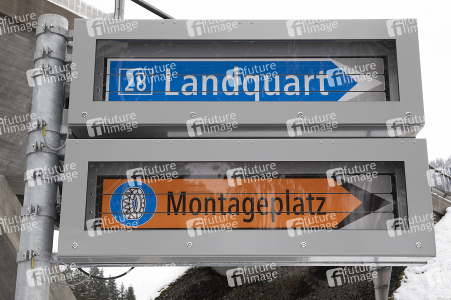 Symbolfoto Wegweiser für Hauptstrassen und Schweizer Verkehrszeichen '248, Schneeketten obligatorisch' mit Hinweis Montageplatz, Davos, 22.12.2019