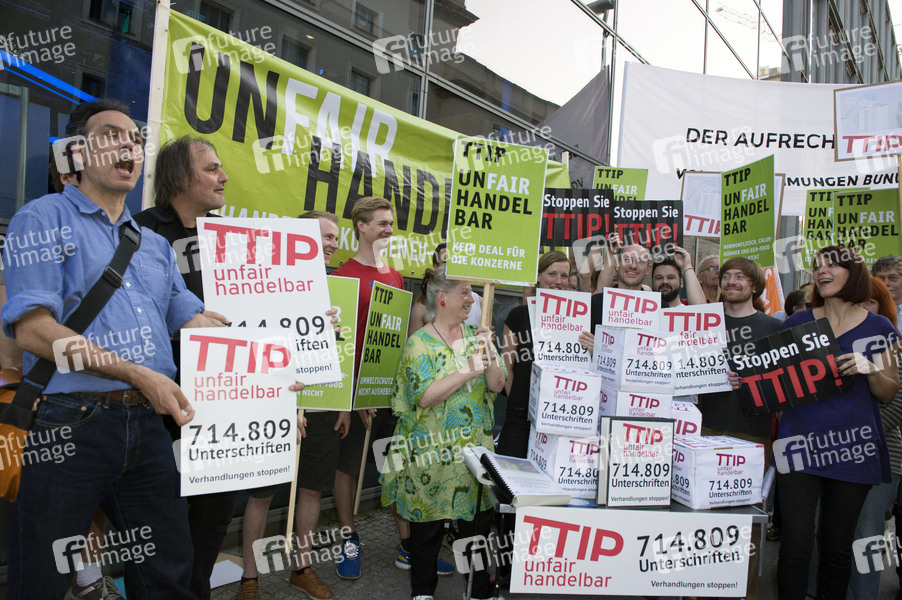 Gegner des Freihandelsabkommen TTipp vor der Telekom Hauptstadtrepräsentanz, in der die TV-Talksendung 'Wie geht´s, Europa?' mit Maybrit Illner und Mitri Sirin stattfindet. Berlin, 22.05.2014