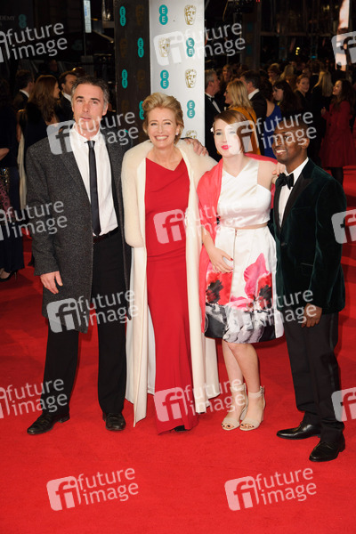 Emma Thompson mit Tochter Gaia Wise, Adoptivsohn Tindyebwa Agaba und Ehemann Greg Wise bei den 67. BAFTA Awards 2014 in der Royal Opera. London, 16.02.2014