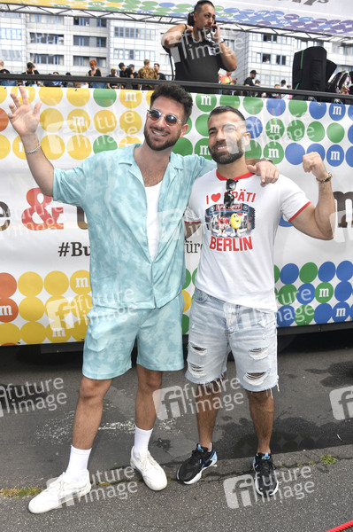 Alexander Schäfer und Rafi Rachek vor dem M&M's Truck bei der 44. Christopher Street Day Parade 2022 unter dem Motto 'United in Love! Gegen Hass, Krieg und Diskriminierung' vom Spittelmarkt auf gut sieben Kilometern über Potsdamer Platz und Potsdamer Straße zum Nollendorfplatz, von dort weiter zur Siegessäule und zum Brandenburger Tor. Berlin, 23.07.2022