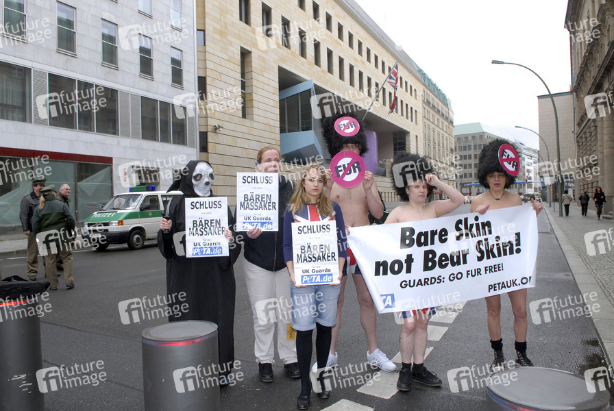Demonstarion von Tierrechtlern vor der Britischen Botschaft in Berlin. PeTA Deutschland e.V. appelliert an die Queen Schluss mit dem Bärenfellmassaker für die Palastwache zu machen.