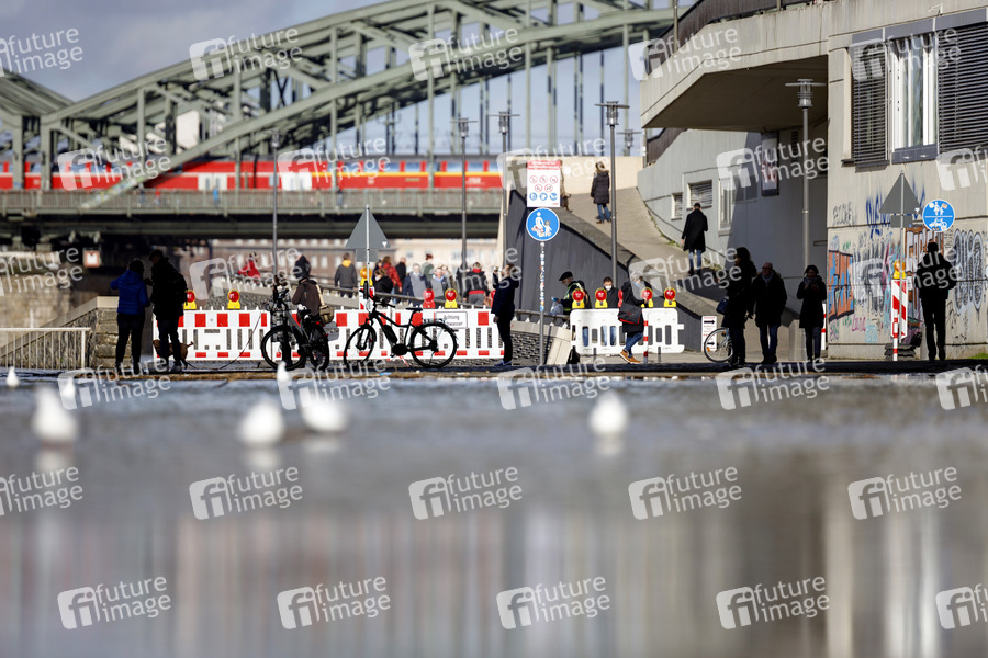 Rheinpegel, Fluss, Rhein, Pegelstand, Pegel, Hochwasser, Rheinboulevard, Pegelmarke, Hochwassermarke, Hochwasserwelle, Scheitelpunkt, Rhein-Pegel, Flussbett, Flut, Schifffahrt, Hochwasserschutz, Wasserstand, Mittelwasser, Tauwetter, Rheinschifffahrt, Rheinufer, Rhein-Ufer, Hochwasserschutzzentrale, Hochwasserwelle, Rheinuferpromenade, Pegel-Nullpunkt, Hochwasserlage, Hochwassermeldedienst, Hochwasserinformationsdienst, Wasserstände, Pegelstände, Wetterlage, ansteigendes Wasser, steigender Pegel, unter Wasser, überflutet, Rheinufer, Schmelzwasser, Wetter, Scheitelpunkt, kritische Marke, Hochwassermarke, Rheinboulevard, Hohenzollernbrücke, Symbolbild, Symbolfoto