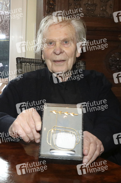 Klaus Gendries mit dem Fernsehpreis 1985 'DDR Deutscher Fernsehfunk', auch 'Fernsehlorbeer' genannt, bei der Aufzeichnung der Fernsehsendung zum 100. Geburtstag von Herbert Köfer. Berlin, 10.02.2021