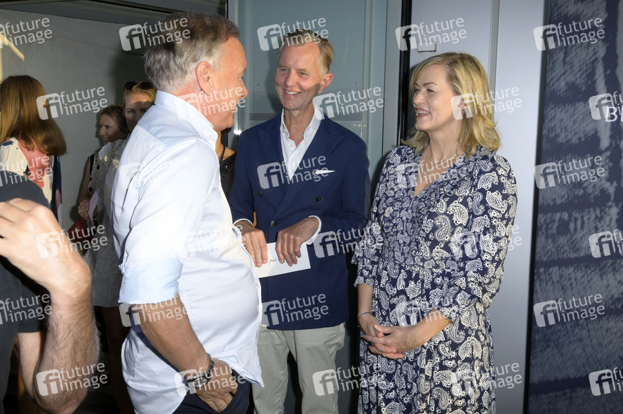 Nico Hofmann, Max Raabe und Gesine Cukrowski beim Eröffnungsempfang der UFA Filmnächte 2022 auf der Dachterrasse der Bertelsmann Repräsentanz. Berlin, 24.08.2022