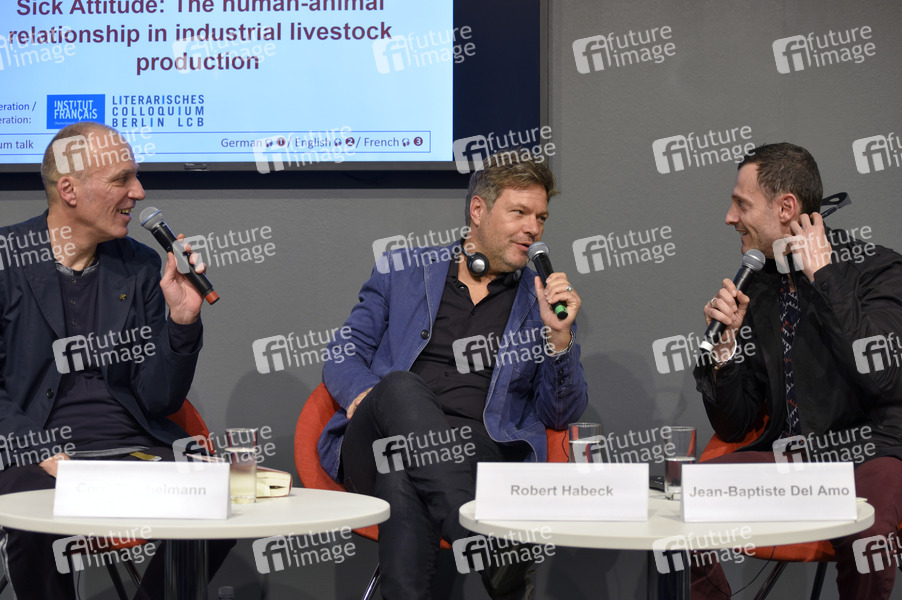Cord Riechelmann, Roland Habeck und Jean-Baptiste Del Amo bei der Podiumdiskussion 'Kranke Haltung: Das Mensch-Tier-Verhältnis in der industriell betriebenen Zucht' auf der 71. Frankfurter Buchmesse 2019 auf der Messe Frankfurt. Frankfurt am Main, 16.10.2019