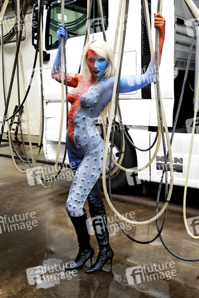 Bodypainting und Photoshooting mit Model Anastasia in einer Auto- und LKW-Waschanlage in Lauenau. Bodypaint Künstler: Jörg Düsterwald
