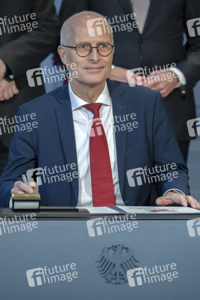 Peter Tschentscher bei der Unterzeichnung der Vereinbarung zur Olympiabewerbung im Bundeskanzleramt. 04.12.2025