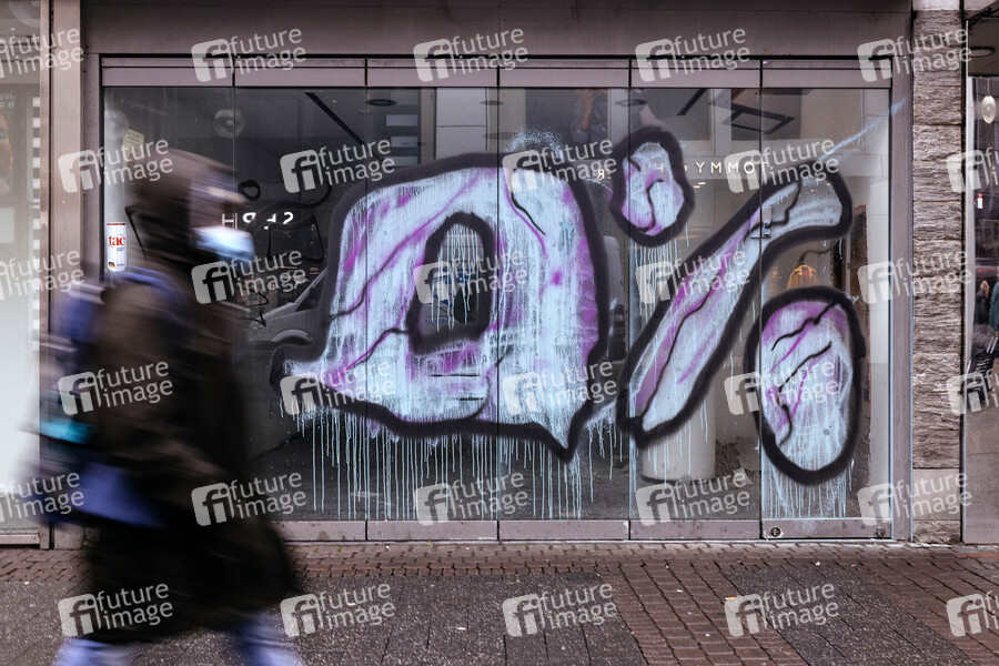 Der durch das Coronavirus bedingte Lockdown im Einzelhandel treibt viele Unternehmen an den Rande des Ruins. Im Bild ein Ladengeschäft in der Einkaufszone Schildergasse, das leer ist und an dessen Scheibe jemand '0%' gesprüht hat. (Themenbild, Symbolbild) Köln, 09.01.2021