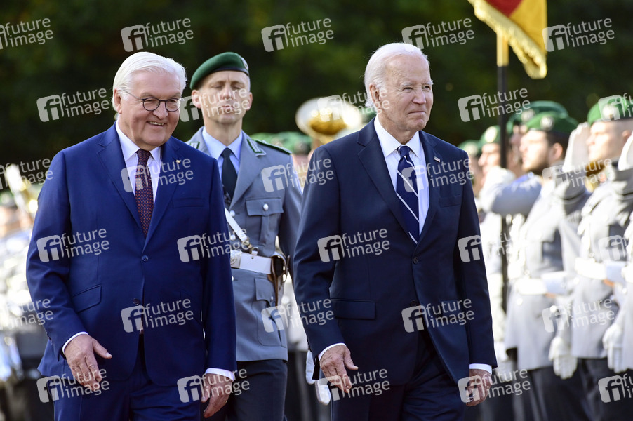 Frank-Walter Steinmeier und Joe Biden beim Empfang des amerikanischen Präsidenten mit militärischen Ehren und zum gemeinsamen Gespräch im Schloss Bellevue. Berlin, 18.10.2024