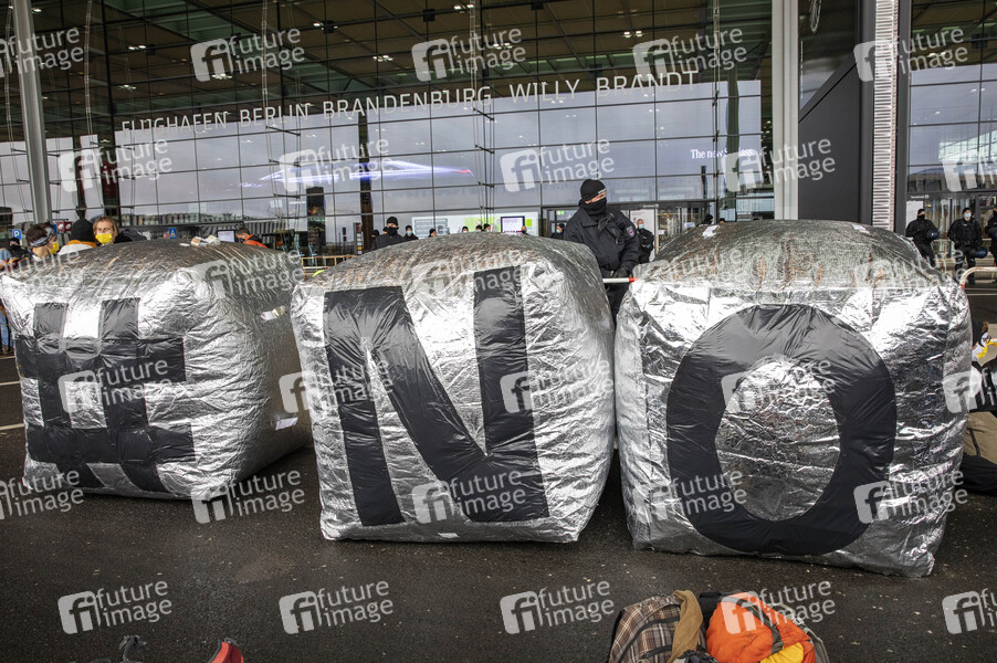 Protestaktionen von Mitgliedern des Bündnisses 'Am Boden bleiben' bei der Eröffnung des Flughafens Berlin-Brandenburg (BER). Schönefeld, 31.10.2020