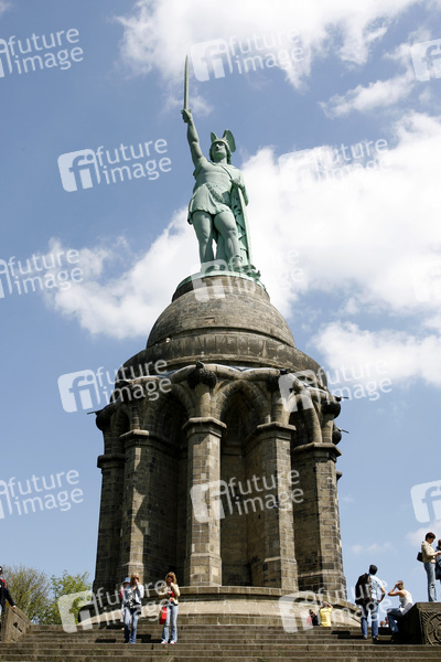 soll an den Cheruskerfürsten Arminius (Lateinisch, in deutsch: Hermann) erinnern, Gesanthöhe 53.46 m, Sandsteinunterbau 26.89m, Figur 26.57 m, besteht aus einer Eisenrohrkonstruktion mit Oberfläche aus Kupferplatten, Erbauer Ernst von Bandel, Baubeginn 1838, nach der Revolution von 1848 ruhte der Bau bis 1863, festliche Einweihung 1875