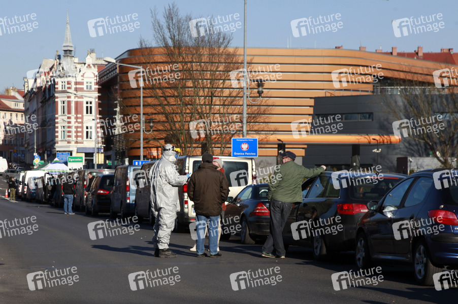 Grenzverkehr, Grenze, EU, Epidemie, Pandemie, Corona, Virus, Infektion, Lungenkrankheit, Schutzmaske, Mundschutz, Schutzanzug, Polen, SARS-CoV-2, Covid-19, Schutzmaßnahmen, Grenzübergang, Corona-Angst, Ansteckungsangst, Seuche, Corona-Test, Corona-Tests, Coronatest, Coronatests, anstecken, Corona-Krise, Vorbeugung, Prävention, schützen, Schutz, Papst-Johannes-Paul-II.-Brücke