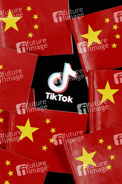 Das Logo der Video-App Tiktok auf einem Bildschirm umringt von chinesischen Flaggen. Ein Richter hat Donald Trumps TikTok-Verbot für unwirksam erklärt. (Symbolfoto, Themenfoto)