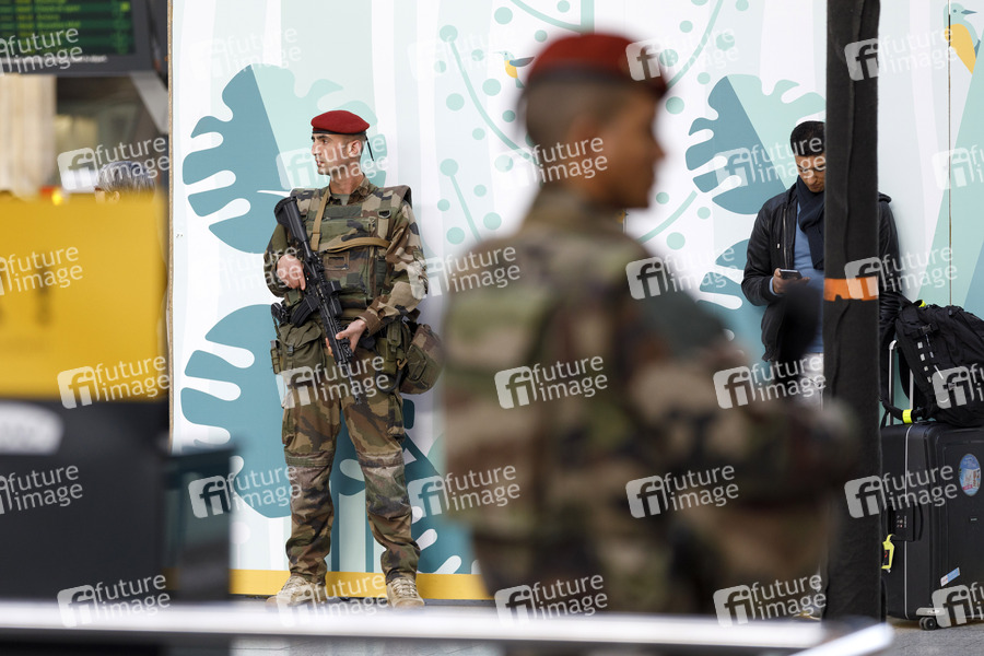 Soldaten bewachen während der Gelbwesten-Proteste auf Geheiß von Präsident Macron öffentliche Gebäude. Im Bild Soldaten am Bahnhof Gare du Nord. Paris, 23.03.2019