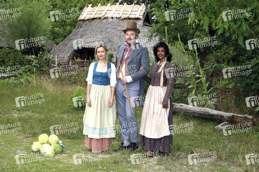 Stefanie Stappenbeck, Stephan Grossmann und Dennenesch Zoude beim Pressefototermin am Set des Märchenfilms 'Das Märchen vom goldenen Taler' für die ARD-Märchenreihe 'Sechs auf einen Streich' im Museumsdorf Düppel. Berlin, 08.07.2020