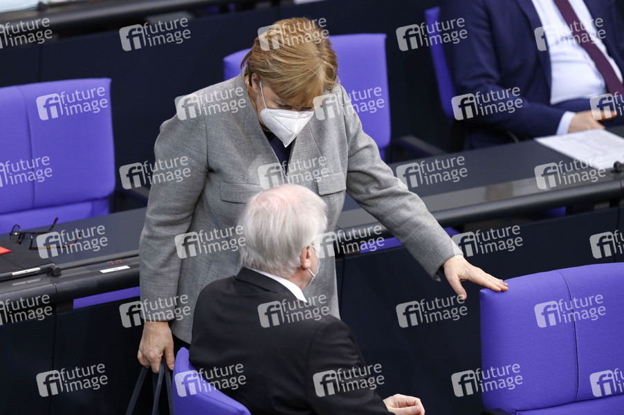 Horst Seehofer und Angela Merkel in der 203. Sitzung des Deutschen Bundestages im Reichstagsgebäude. Berlin, 13.01.2021