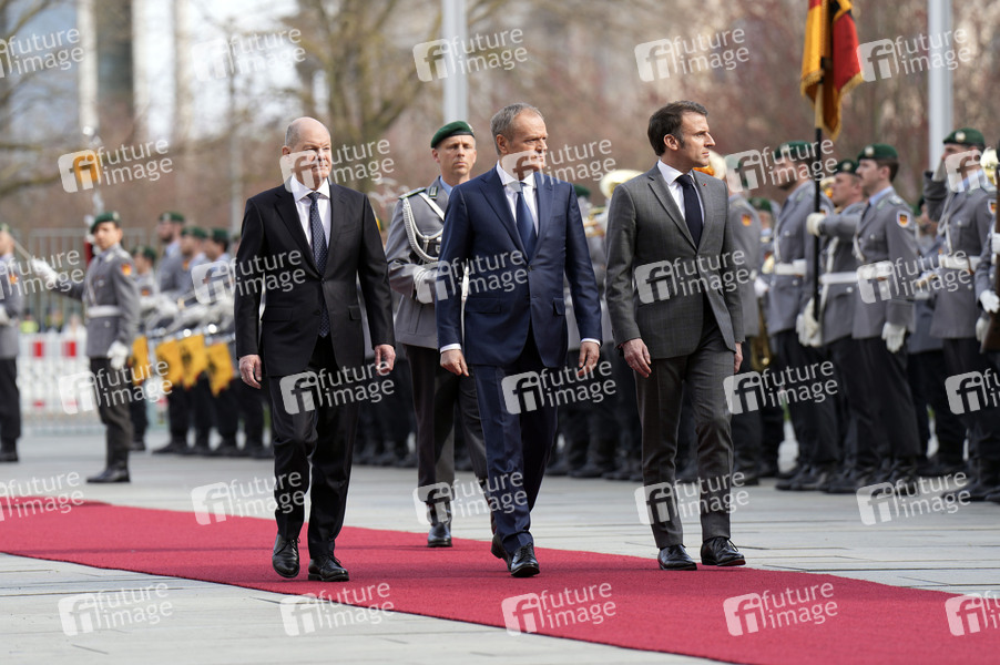 Olaf Scholz, Donald Tusk und Emmanuel Macron beim Empfang des Ministerpräsidenten von Polen und des Staatspräsidenten der Französischen Republik mit militärischen Ehren zu einem gemeinsamen Gespräch mit dem Bundeskanzler im Bundeskanzleramt. Berlin, 15.03.2024