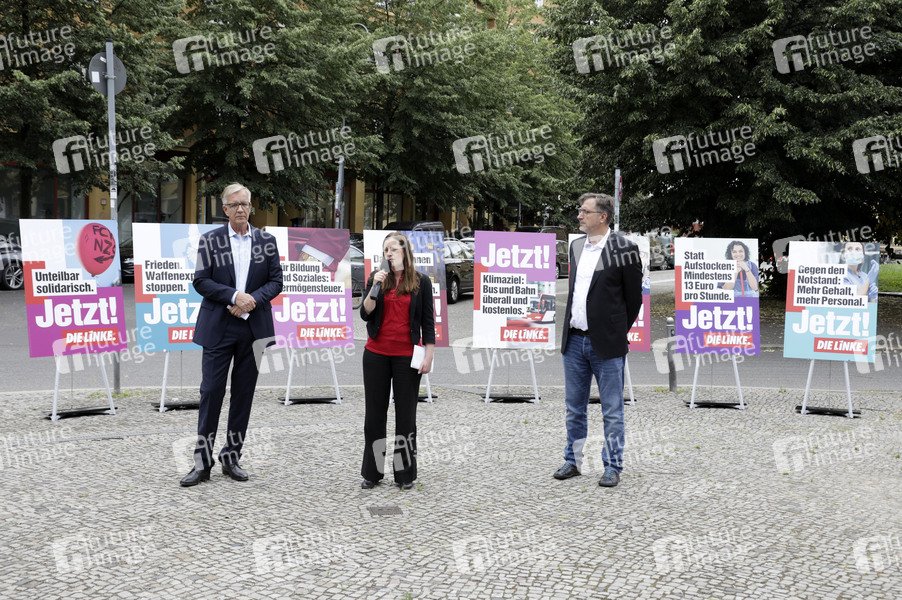 Dietmar Bartsch, Janine Wissler und Jörg Schindler beim Fototermin zur Präsentation der Plakatkampagne der Partei Die Linke zur Bundestagsswahl 2021 vor der Volksbühne am Rosa-Luxemburg-Platz. Berlin, 21.07.2021