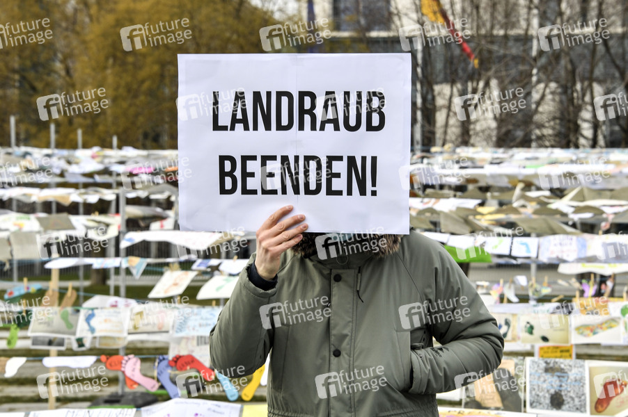 Landwirte, Klima- und Tierschützer demonstrieren unter dem Motto 'Wir haben es satt' für eine Wende in der Agrarpolitik. Vor dem Kanzleramt wird symbolisch mit rund zehntausend Fußabdrücken auf Papier eine bäuerliche, ökologische und klimafreundliche Landwirtschaft gefordert. Berlin, 16.01.2021