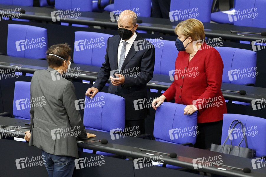 Karl Lauterbach, Olaf Scholz und Angela Merkel in der 238. Sitzung des Deutschen Bundestages im Reichstagsgebäude. Berlin, 25.08.2021