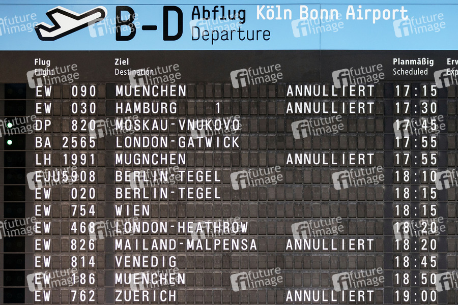 Fluganzeigetafel, Flug annuliert, Flugannulierung, Departure, Coronakrise, Corona-Krise, Schutzmaßnahmen am Flughafen, Airport, Flugausfall, EU-Fluggastrechte-Verordnung, EU-Verordnung, Entschädigung, Flug gestrichen, Ticketpreiserstattung, Erstattung des Tickets, Annulierung, Airline, Abflugszeit, Ankunftszeit, Kurzstrecke, Mittelstrecke, Langstrecke, Schlichtungsstelle, Geld zurück, Rechte, Fluggastrechte, Umbuchen, Anwalt, Umbuchung, Flugstornierung, Ersatzflug, Unannehmlichkeiten, COVID-19, Ausbreitung, weltweiter Ausbruch, Eindämmung, Übertragung, Tröpfcheninfektion, SARS-CoV-2, Lungenentzündung, chronische Grunderkrankung, Corona, Coronavirus, Coronaviren, Corona-Virus, Corona-Viren, Ansteckung, Ansteckungsgefahr, Epidemie, Pandemie, Infizierung, Region, Bundesland, Gebiete, Labordiagnostik, Infektionsquelle, Passagierrückgang, Coronavirus, Köln Bonn Airport, Flughafen Köln Bonn, Flugstreichung, Flugausfälle, Flugausfall, Flugannullierung, Flug annulliert, Flugreise, Flug storniert, Flugstornierung, Flugstornierungen, Flieger verpasst, Koffer-Kuli, Kofferkuli, Gepäckwagen, Handgepäck, Reisekoffer, Reisegepäck, Reiserücktritt, Reiserücktrittsversicherung, Virus, Flugreise, Flugreisen, Flugwetter, Symbolbild, Last Minute, Last-Minute, Last-Minute-Reise, Reisesaison, Ferienzeit, Flughafen, Airport, Ferien, Ferienstart, Ferienflieger, Reiseanbieter, Reisewarnung, Fliegen, Airways, Fracht, Zoll, Luftpost, Fernweh, Einfuhr, Zölle, Duty Free, Gepäck, Abflug, Boarding, Departures, Reisetermin, Flugangst, Luftverkehr, Departure, Terminal, Flughafenparkplatz, Parken am Flughafen, Fluglinie, Fluggesellschaft, Flugverkehr, Flughöhe, Fluggast, Flugreisende, Fluggäste, Flugpassagiere, Flugbegleiter, Billig-Flieger, Billigflieger, Flugplan, Flugaufkommen, Fluglärm, Wettbewerb am Himmel, Flughafen Köln, Billigfluglinie, Landerechte, Flugzeug, Flugzeuge, Cockpit, Stewardess, Steward, Flug, Flüge, Reise, Reisen, Ticketpreise, Triebwerk, Landung, Start, Startbahn, Rollfeld, Handgepäck, Check-In, Inlandsflug, CO2-Bilanz, CO2-Steuer, CO2, Klimagase, Klimawandel, Langstreckenflug, Ferienbeginn, Reisezeit, Verkehrsmittel, Reisen, Flugticket, Reisekosten, Fluggastzahlen, Airport Köln Bonn, Gepäckaufgabe, Airliner, Airline, Startbahn, Landebahn, Flieger, Gangway, Flugverspätung, Flugverspätungen, Parkdeck, Symbolbild, Symbolfoto