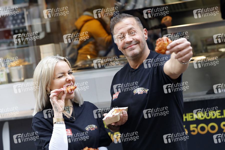 Miss Sugar und Willi Herren bei der Eröffnung von 'Willi Herren's Rievkooche Bud'. Willi Herren stellt seinen Reibekuchen-Truck am Gelände der Selgros vor. Köln, 16.04.2021