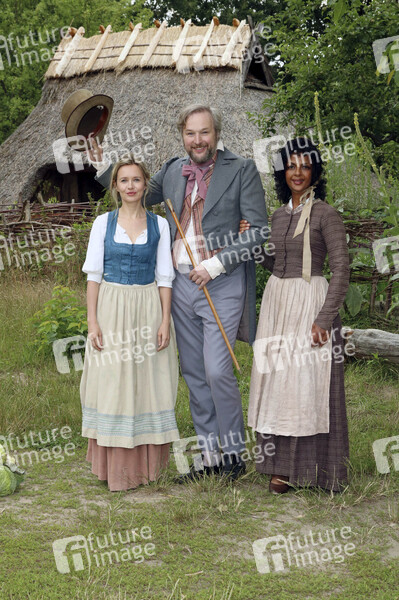 Stefanie Stappenbeck, Stephan Grossmann und Dennenesch Zoude beim Pressefototermin am Set des Märchenfilms 'Das Märchen vom goldenen Taler' für die ARD-Märchenreihe 'Sechs auf einen Streich' im Museumsdorf Düppel. Berlin, 08.07.2020