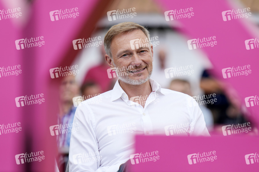 Christian Lindner bei einer Wahlkampfveranstaltung der FDP zur Landtagswahl in Brandenburg im Mahlower Seebad. Blankenfelde-Mahlow, 15.08.2024