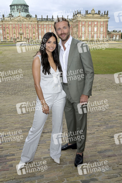Amira Pocher mit Freund Christian Düren bei der Marc Cain Fashion Show 'Pure Radiance - Frühjahr/Sommer 2025' auf der Berlin Fashion Week S/S 2025 in der Kolonnade mit Triumphtor am Neuen Palais. Potsdam, 02.07.2024