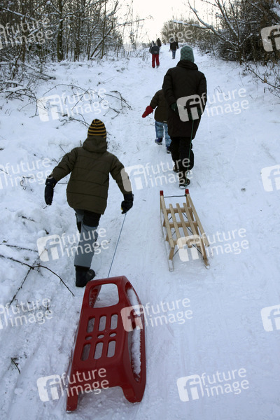 Mit Schlitten auf dem Weg zum Teufelsberg. Berlin, 05.01.2009