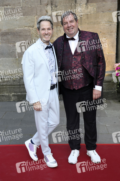 Bernd Reisig mit Gast bei der Eröffnung der 74. Bad Hersfelder Festspiele 2025 mit dem Theaterstück 'Sommernachtsträume' in der Stiftsruine. Bad Hersfeld, 20.06.2025