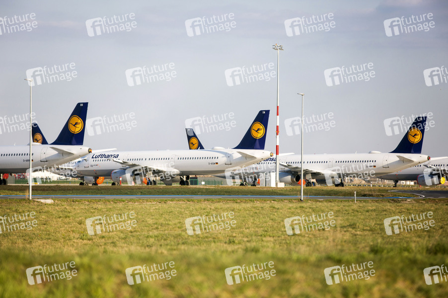 Viele Flugzeuge bleiben am Boden am Flughafen Berlin-Schönefeld. Aufgrund der Corona-Krise sind in Schönefeld die Passagierzahlen eingebrochen. Der Airport ist fast menschenleer. An diesem Mittwoch flog nur eine einzige Ryanair-Maschine nach London. Berlin, 01.04.2020