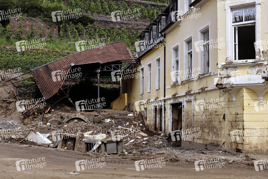 Nach dem Jahrhunderthochwasser in der Eifel durch heftige Regenfälle und Dauerregen mit Überschwemmungen und Überflutungen haben die Aufräumarbeiten im Ahrtal große Fortschritte gemacht. Einheiten von Polizei, THW, Bundeswehr und Feuerwehr mitsamt vielen freiwilligen Helfern haben Straßen geräumt, Schutt und Schlamm entfernt und die Menschen versorgt. Der Wiederaufbau wird trotzdem Jahre dauern. Im Bild Flutschäden in der Ortschaft Mayschoß, in der die Flut viele Häuser zerstörte, 08.08.2021