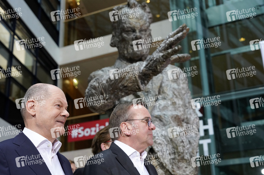 Olaf Scholz und Boris Pistorius bei der Pressekonferenz der SPD nach den Gremiensitzungen zur Beratung aktueller Themen und der Nominierung des SPD-Kanzlerkandidaten für die Bundestagswahl im Atrium vom Willy-Brandt-Haus. Berlin, 25.11.2024