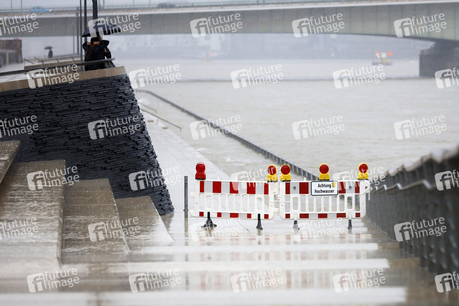 Anhaltende Regenfälle durch Tief Bernd haben in Köln und Umland zu Hochwasser, steigendem Rheinpegel und überfluteten Straßen, Kellern und Fahrbahnen geführt. Am Rheinboulevard überspülte das Wasser die Stufen. Feuerwehr und THW waren im Dauereinsatz. Der Deutsche Wetterdienst hatte zuvor vor extremen Dauerregen gewarnt. Köln; 14.07.2021