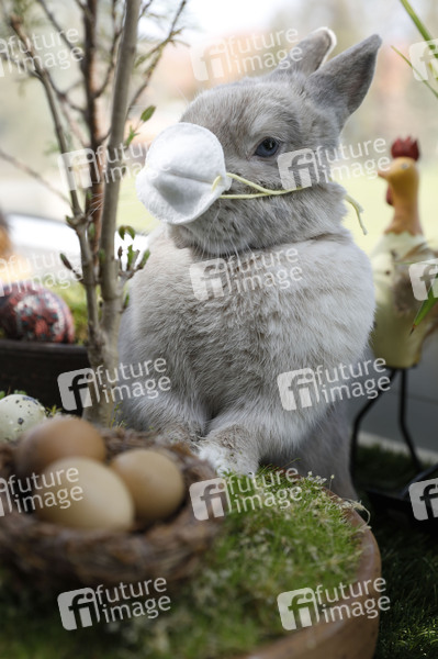 Hase, Osterhase, Kaninchen, Zwergkaninchen, Easter Bunny, Frohe Ostern, Oster-Geschenke, Ostern, Osternest, Ostersaison, Osterzeit, Ostereier, Feiertag, Ostersonntag, Ostermontag, Atemschutz, Atemschutzmaske, Virenschutz, Schutzmaske, Schutzmasken, Atemschutzmasken, Mundschutz, Mund-Schutz, Mundschutzpflicht, Mundschutz-Pflicht, Mund-Nase-Schutz, Mund-Nasen-Schutz, MNS, Ausbreitung, Maskenzwang, Maskenpflicht, Infektionsgefahr der Öffentlichkeit, Lock Down, Lockdown, Öffentlichkeit, Eindämmung, Seucheneindämmung, anstecken, infizieren, Vorbeugung, Prävention, schützen, Einschränkung, Verzicht, Seuchenschutz, Corona-Schutz, Virus, Viren, Corona, Sars-CoV-2, Covid-19, Coronavirus, Coronaviren, Corona-Virus, Corona-Viren, Ansteckung, Ansteckungsgefahr, Epidemie, Pandemie, Infektion, Infektionen, Corona-Maßnahmen, Symbolfoto, Symbolbild