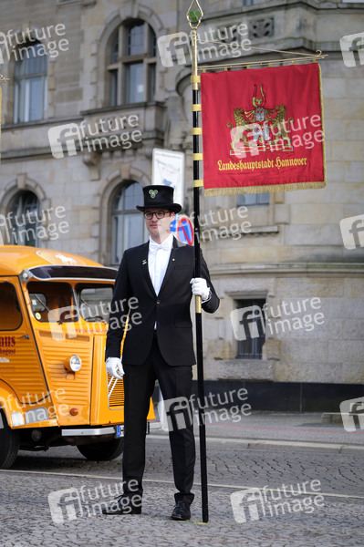 Bruchmeister Jürgen Schnabel beim symbolischen Fassbieranstich zum 491. Schützenfest, welches am 3.Juli 2020 eröffnet worden wäre, aber wegen der Corona-Pandemie nicht stattfindet, auf dem Trammplatz vor dem neuen Rathaus. Hannover, 03.07.2020
