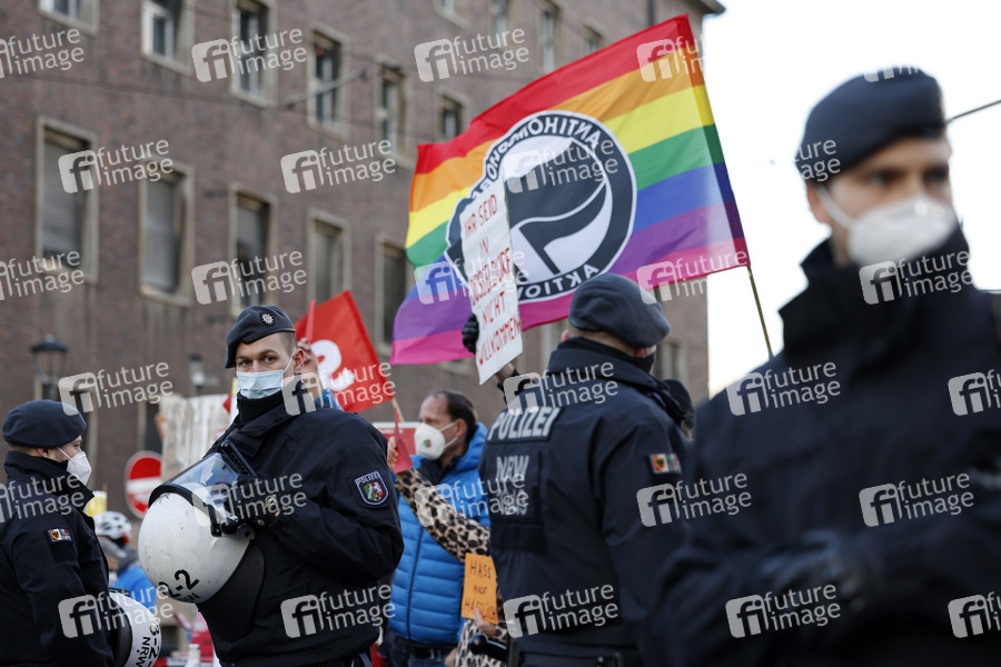 APO Düsseldorf, 2G-Regel, 2G, 2G-Plus, Bewegung, Corona, Coronademo, Corona-Demo, Corona-Demonstranten, Corona-Kontrolle, Corona-Kontrollen, Coronakrise, Coronamaßnahmen, Corona-Maßnahmen, Corona-Politik, Coronaproteste, Corona-Proteste, Corona-Regeln, Coronaregeln, Coronaskeptiker, Corona-Skeptiker, Corona-Spaziergang, Corona-Spaziergänger, Coronavirus, Demo, Demonstration, Demonstrationsrecht, Freiheitsrechte, Gesundheitssystem, Gesellschaft, Grundrechte, Impfen, Impfgegner, Impfpflicht, Impfung, Impfzwang, Infektionsschutzgesetz, Innenpolitik, Maskenpflicht, Mindestabstand, Nebenwirkungen, Politik, Querdenken, Querdenker, Pfleger, Pflegekräfte, Sicherheit, Sicherheitsmaßnahmen, Spaltung der Gesellschaft, Spazieren, Spazierengehen, Spaziergänger, Spaziergang, Umzug, Versammlungsrecht, Virus, Coronaleugner, Corona-Leugner, Verschwörungstheoretiker, Schild, Pflegekraft, Gesundheitsbereich, Linke, Gegendemo, Gegendemonstranten, rote Karte, Antifa, Antiverschwurbelte Aktion, Regenbogenflagge, antihomophobe Aktion, gegen Homophobie