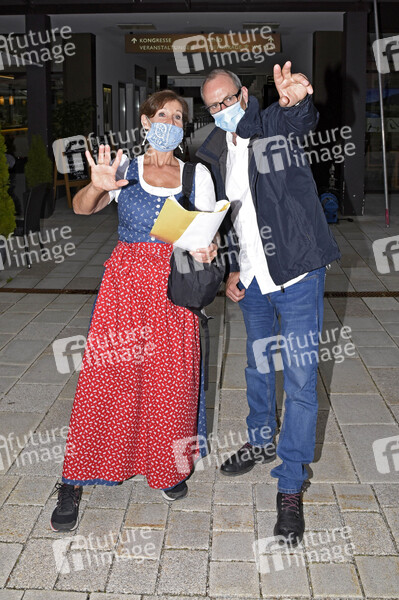 Barbara Weinzierl und Jörg Schneider bei einem exklusiven Fototermin in Berchtesgaden, wo gerade die Dreharbeiten zur Fernsehserie 'Watzmann ermittelt' nach dem Corona Lockdown wieder aufgenommen wurden. Berchtesgaden, 01.07.2020