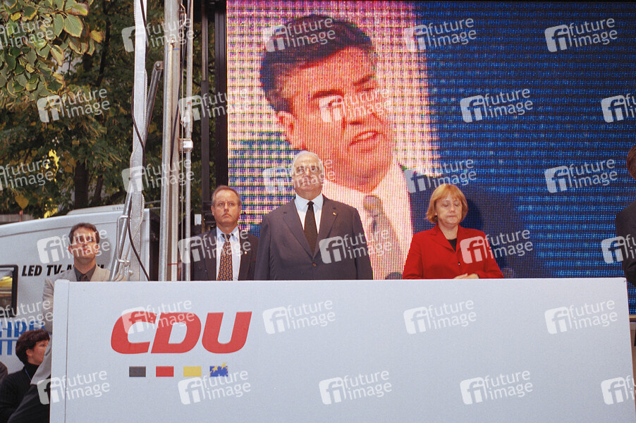 Helmut Kohl und Angela Merkel bei einer CDU-Wahlkampfveranstaltung zur 5. Berliner Abgeordnetenhauswahl auf dem Wittenbergplatz. Berlin, 03.10.2001