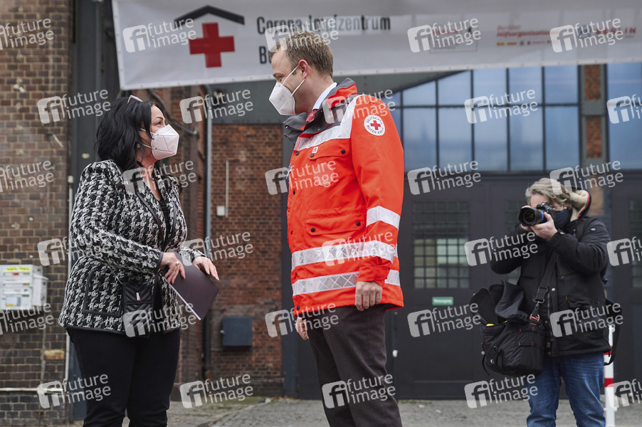 Berlins Gesundheitssenatorin Dilek Kalayci und Mario Czaja (Präsident Berliner Landesverband Deutsches Rotes Kreuz, DRK) bei der Inbetriebnahme des Corona-Impfzentrums in der Arena Berlin. Berlin, 27.12.2020