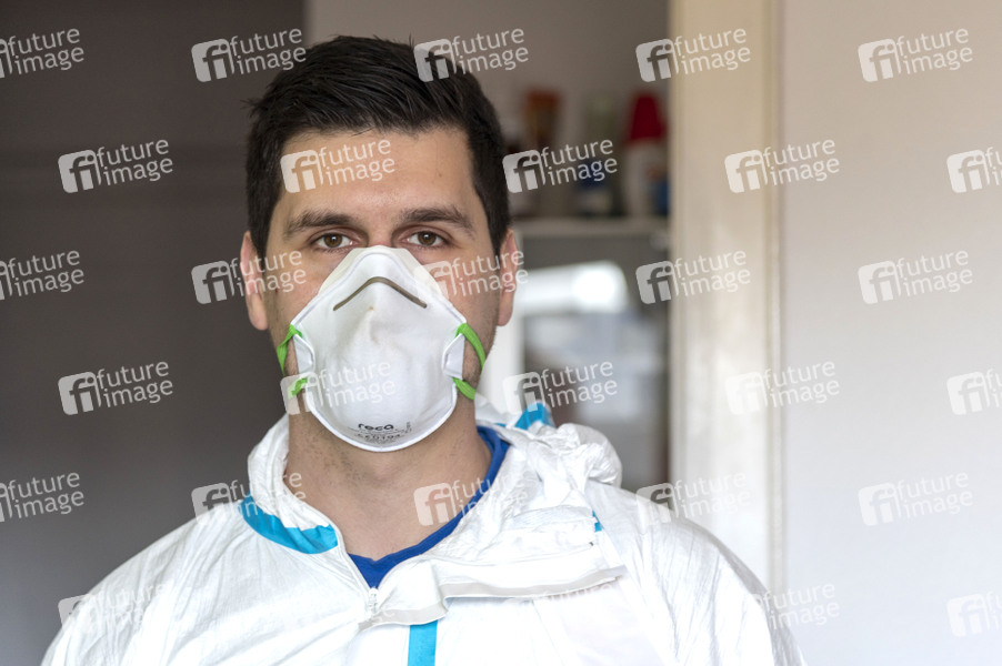 Schornsteinfeger Thomas G. arbeitet während der Coronakrise mit Mundschutz und Schutzkleidung. Nürnberg, 30.03.2020